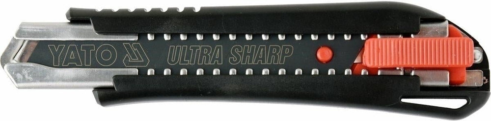 Coltello con lama a spezzare da 18 mm di YATO YT-75123. Lame in acciaio ULTRA SHARP SK2H ricoperte da uno speciale rivestimento nero che garantiscono un'affilatura eccezionale, corpo in resistente plastica ABS. L'impugnatura è inoltre dotata di un rivestimento antiscivolo in TPR. Ciò garantisce una presa salda e un elevato comfort di lavoro. La guida in metallo assicura un funzionamento fluido e senza intoppi. Inoltre, è dotato di un sistema "auto lock" che protegge la lama da estensioni o retrazioni accidentali durante il lavoro, resistendo a una forza fino a 20N. Grazie al sistema "auto lock", il coltello funziona perfettamente quando si tagliano materiali spessi o in spazi stretti dove c'è il rischio che la lama si incastri.
