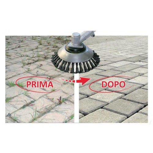Wussten Sie, dass Sie Ihren Trimmer und Ihr Kombigerät auch verwenden können, um Ihren Bürgersteig, Ihre Einfahrt oder Ihren Gartenbelag blitzschnell umwerfend aussehen zu lassen? Der gedrehte Stahldraht der Universal-Kegelbürste 200 mm entfernt mühelos alle Unkräuter, sodass Sie kein schädliches Gift mehr benötigen! Die Bürste hat einen Durchmesser von 20 cm und ist für Motorsensen mit 25,4 mm Schaft geeignet. Die Bürste funktioniert am besten in Kombination mit Motorsensen/Kombigeräten mit einer Leistung von mindestens 35 cc, wie dem Kibani® 52 cc Brushcutter und dem Kibani® 52 cc Combi Tool.