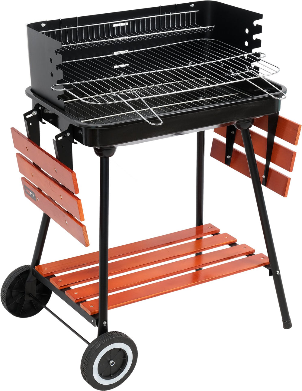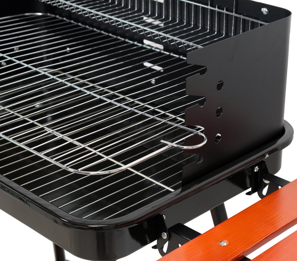 I ripiani laterali pieghevoli in legno offrono spazio per la preparazione degli alimenti, mentre il ripiano inferiore in legno permette di riporre accessori e carbone. Le due ruote di trasporto facilitano lo spostamento del barbecue, rendendolo comodo anche su terrazze e giardini.