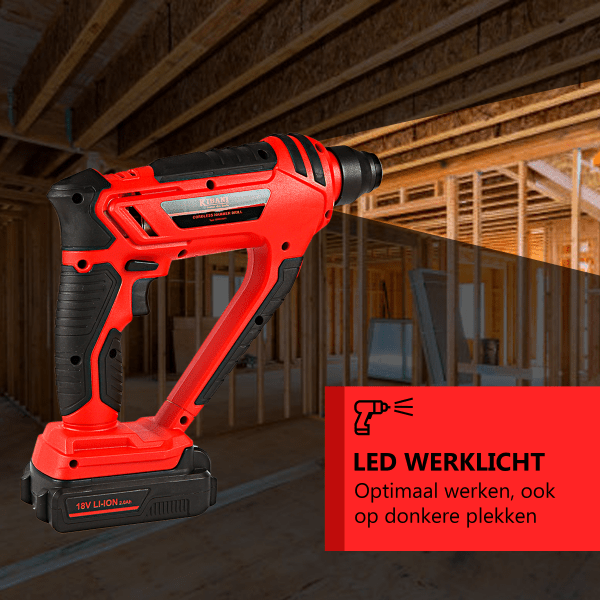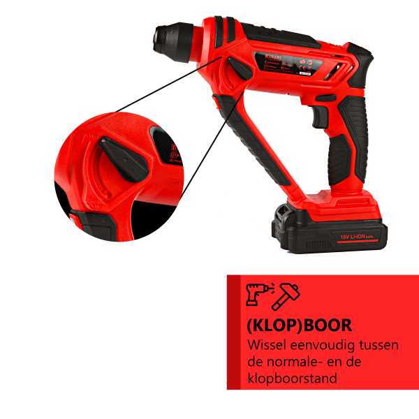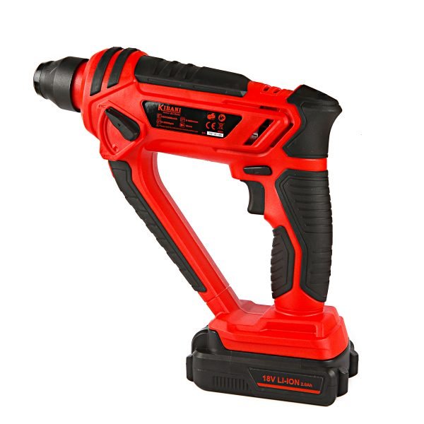 Ce puissant marteau perforateur sans fil Kibani 18V a 3 fonctions et peut donc être utilisé comme perceuse à percussion, visseuse et perceuse ! Cela signifie qu'à partir de maintenant, vous pouvez effectuer n'importe quel travail à la maison, au garage ou à l'atelier. Une fois que vous avez reçu votre perceuse à percussion, vous pouvez commencer immédiatement. Il est livré avec une batterie de 2000 mAh, un chargeur rapide, 3 forets à béton SDS-plus, 3 forets HSS, 5 embouts à vis, un porte-embout, une rallonge d'embout et un sac de rangement. Il dispose également d'une fonction d'arrêt rapide. Cela signifie que la tête de forage s'arrête très rapidement après avoir relâché le levier, cela vous assure de travailler avec plus de précision et votre batterie dure plus longtemps !