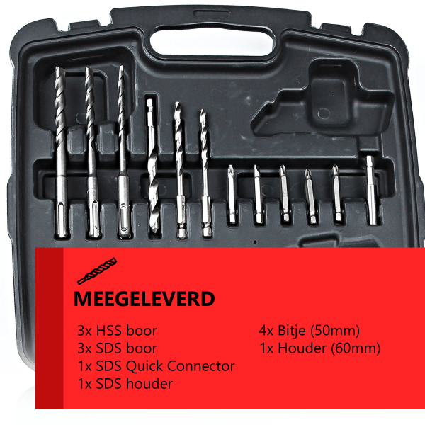 - Livré avec 3 forets à béton HSS, 3 forets SDS-plus, 5 embouts de vissage, porte-embout, rallonge d'embout, mallette.
