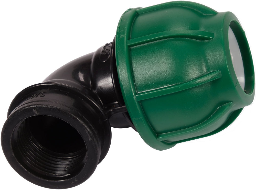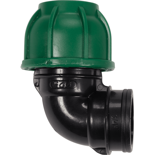 Il gomito a 90° FLO 25 mm x 3/4" GW è un raccordo femmina a compressione progettato per unire un tubo in polietilene (PE) da 25 mm a un componente con filettatura femmina da 3/4”, garantendo una connessione sicura ad angolo retto.