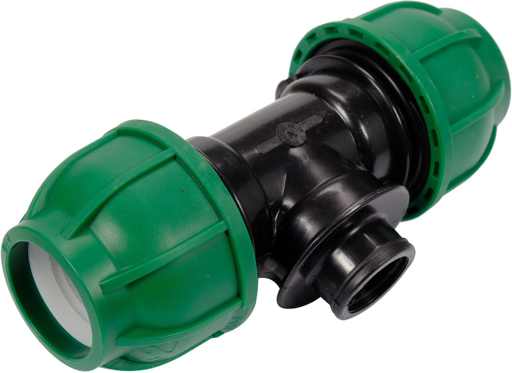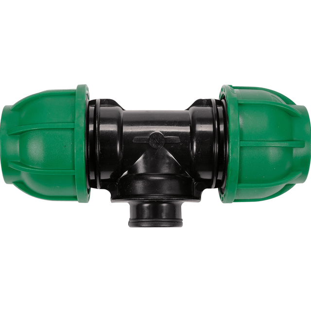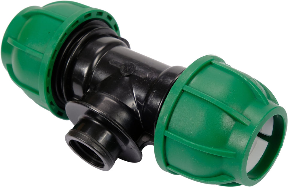 Il raccordo a T FLO 32 x 1/2" x 32 mm è progettato per collegare due tubi in PE da 32 mm con una derivazione centrale filettata femmina da 1/2" (GW). Perfetto per la realizzazione di impianti idrici e di irrigazione dove è necessario aggiungere una derivazione filettata.