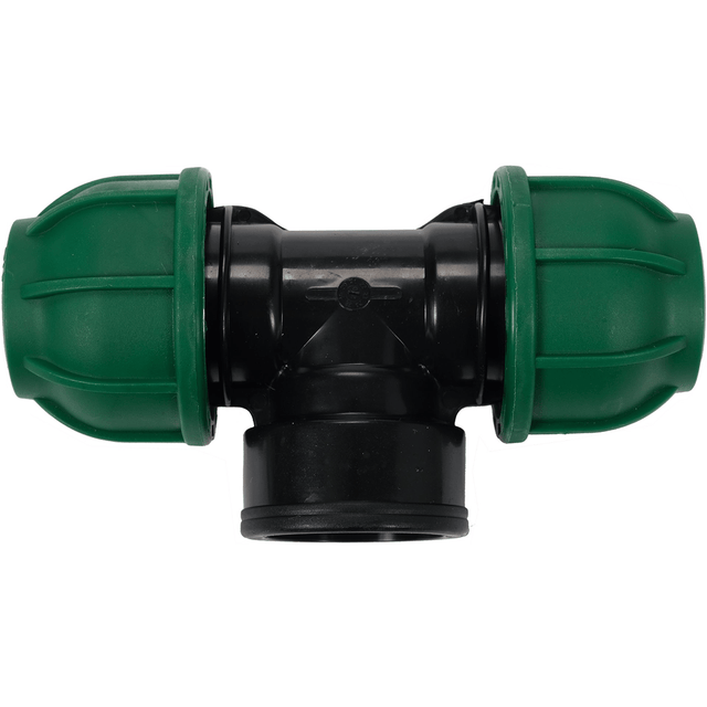 Il raccordo a T FLO 25 mm x 1" x 25 mm è progettato per collegare due tubi in polietilene (PE) da 25 mm e integrare una derivazione centrale filettata femmina da 1" (IT). Ideale per collegare valvole, filtri, rubinetti o altri dispositivi filettati in impianti di irrigazione o idrici.
