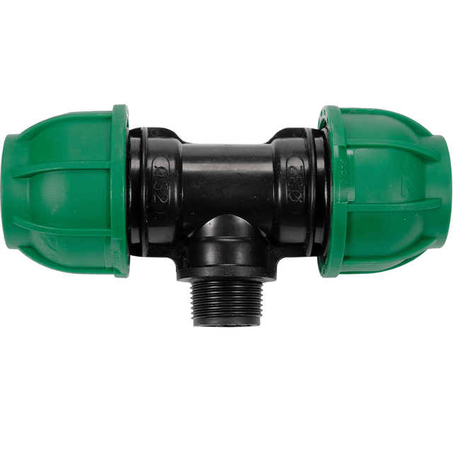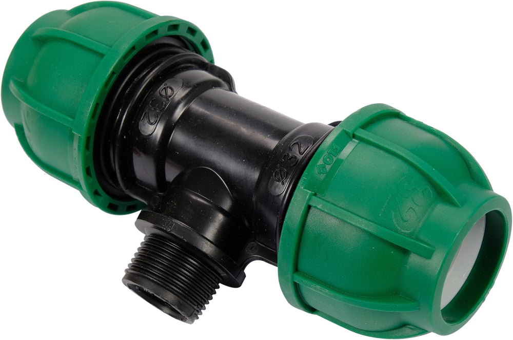 Il raccordo a T FLO 32 mm x 3/4" x 32 mm è progettato per unire due tubi in polietilene (PE) da 32 mm con una diramazione centrale filettata maschio da 3/4" (GZ), ideale per integrare dispositivi o raccordi filettati all’interno di un impianto idrico o di irrigazione.