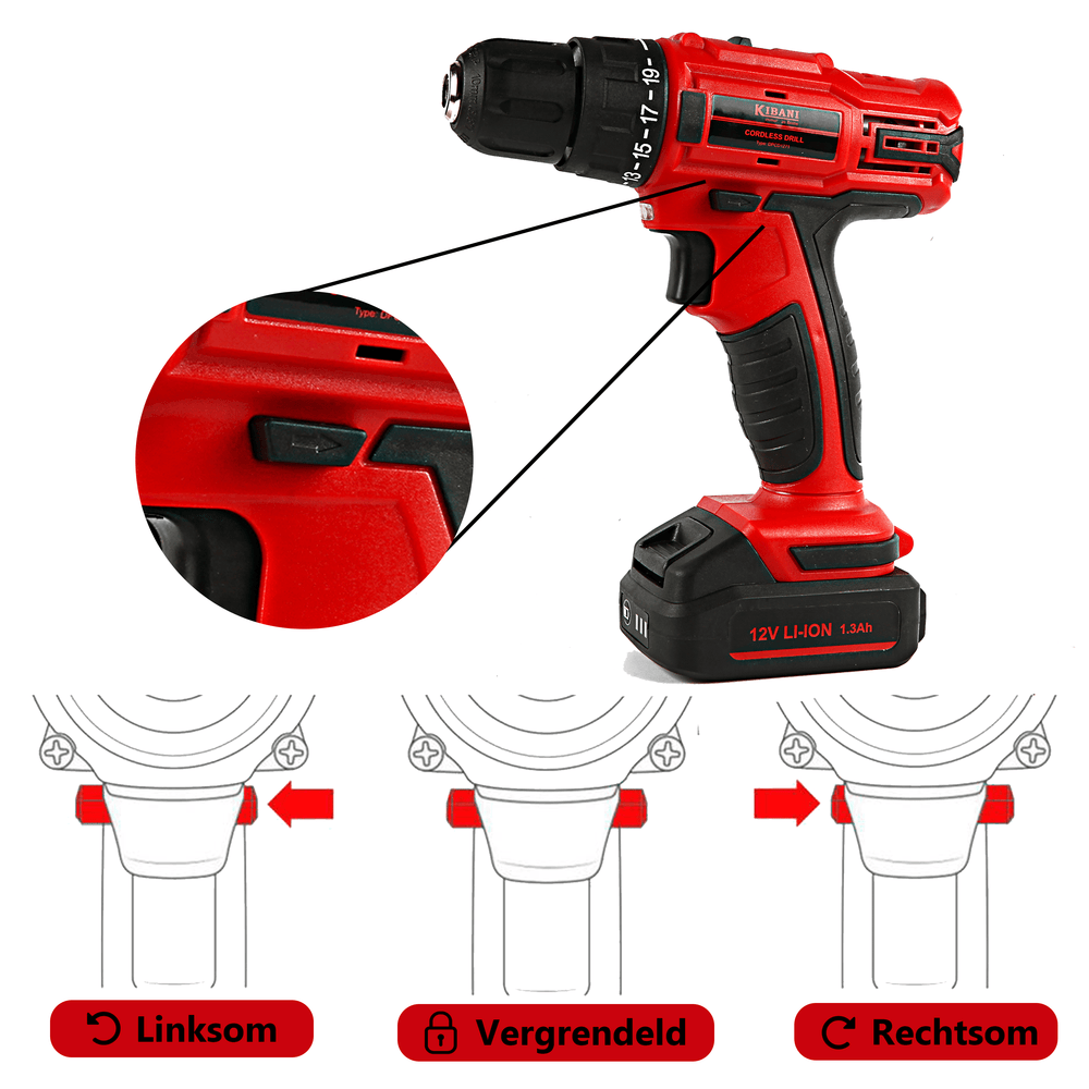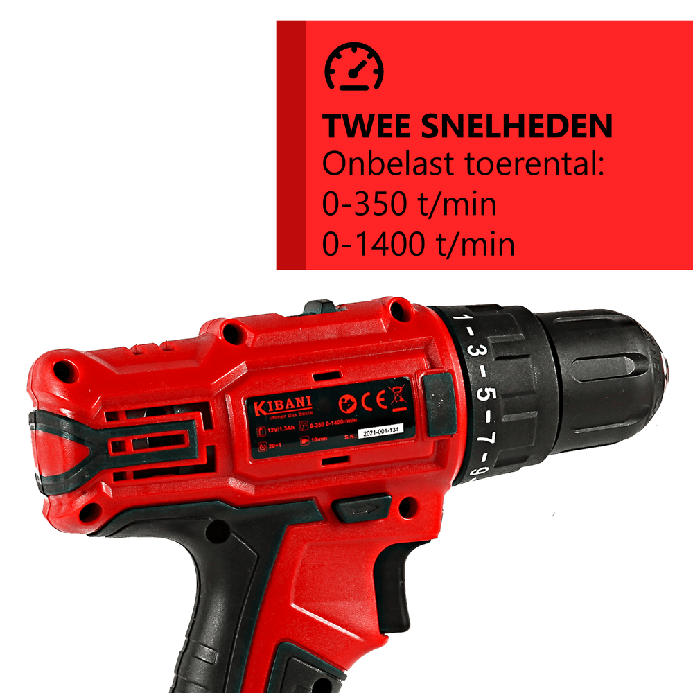 Praticare dei fori o stringere alcune viti? Allora il trapano avvitatore a batteria 12V Kibani è perfetto per te! Il trapano ha una potente batteria da 12 V da 1300 mAh.La batteria appartiene alla piattaforma della batteria Kibani. Il trapano ha una coppia massima di 22NM. Il trapano ha anche 2 impostazioni di velocità e ha una luce a LED, così puoi ancora vedere cosa stai facendo negli angoli bui. La batteria da 12V si ricarica completamente entro 4,5 ore. Il trapano avvitatore a batteria ha anche una funzione di arresto rapido. Ciò significa che la testa del trapano si ferma molto rapidamente dopo aver rilasciato la leva, questo assicura che tu possa lavorare con maggiore precisione e che la batteria duri più a lungo!