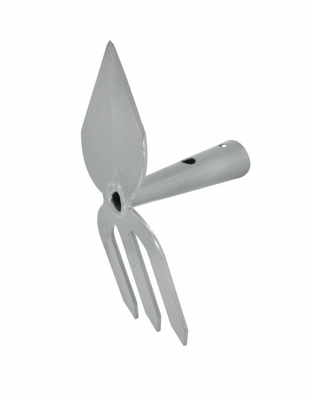 Una zappa a forma di cuore su un lato della testa può essere utilizzata per scavare.< /span>Il rastrello/coltivatore a tre punte facilita il dissodamento del terreno duro.