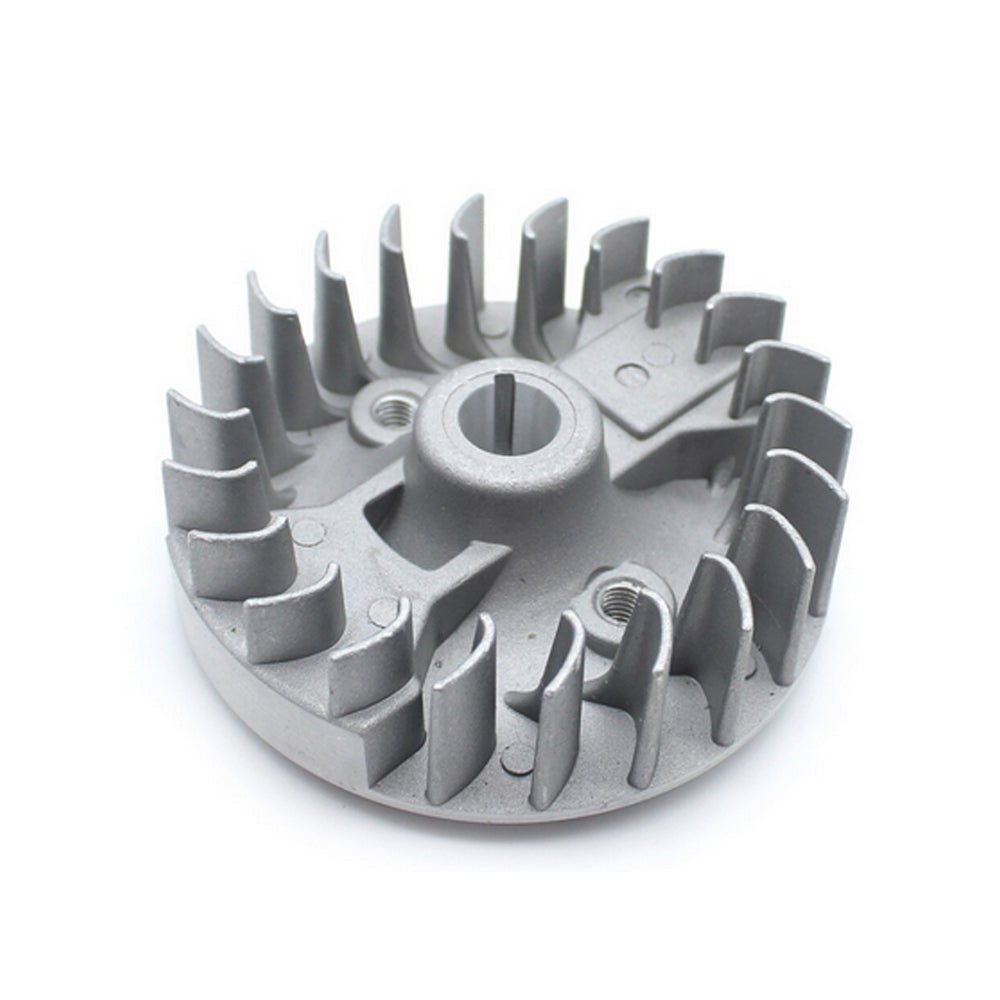 Volano di ricambio per decespugliatore, progettato per un avviamento ottimale e una stabilizzazione del motore.