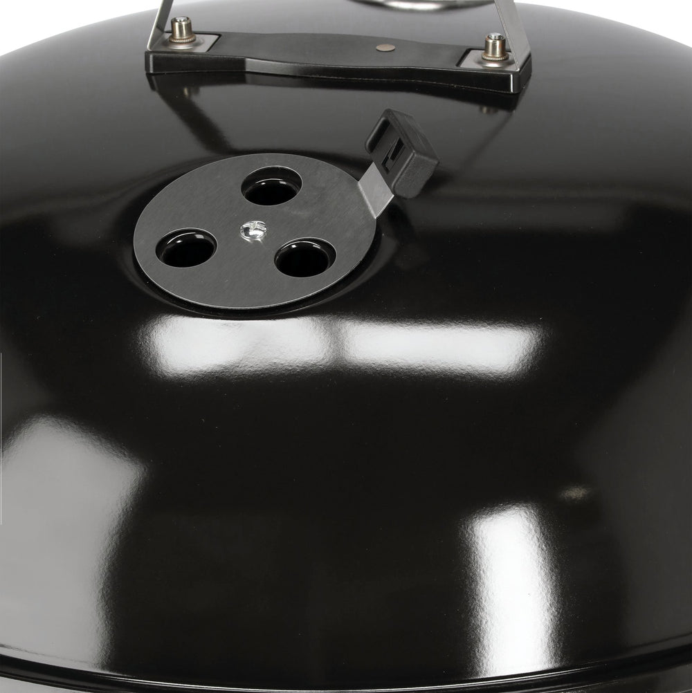 Il barbecue a carbone in acciaio con griglia cromata e coperchio è progettato per garantire un controllo preciso della combustione e della temperatura durante la cottura.
