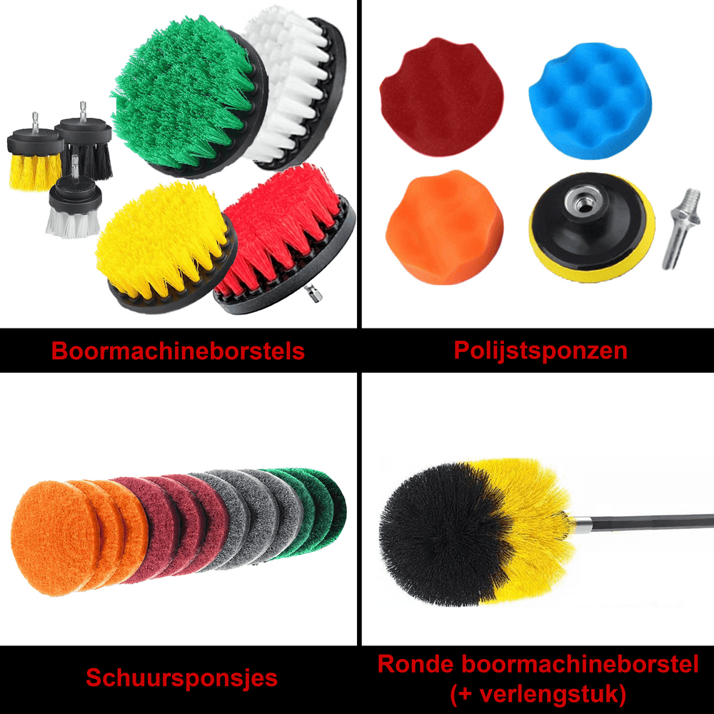 Con le 25 diverse spazzole puoi pulire il bagno, la tappezzeria, il pavimento, il tappeto, la doccia, il bagno, la toilette e molto altro! Le setole in nylon sono resistenti e non danneggiano le superfici. Con le spazzole più piccole puoi raggiungere facilmente luoghi normalmente difficili da raggiungere. Ad esempio, pensa alle pentole, ai fornelli, all’auto, ecc.